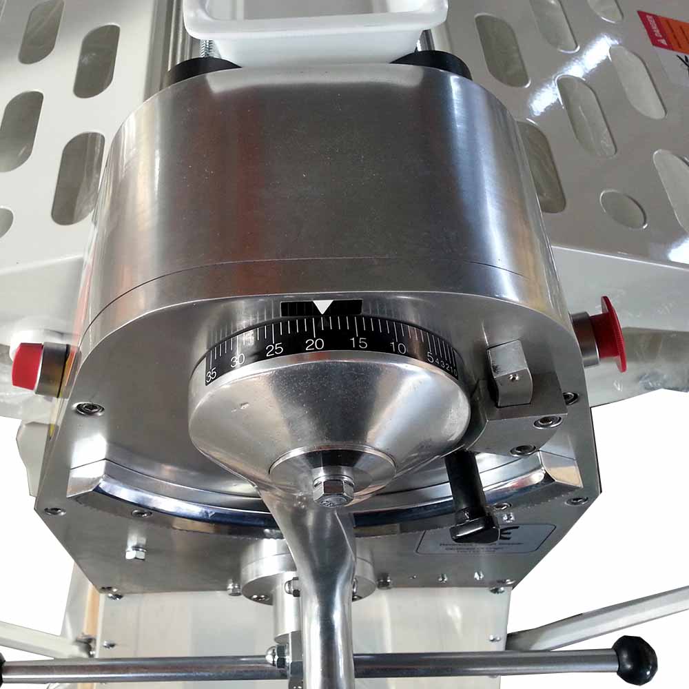 The dough sheeter can work any type of dough even when this is very thin. The hard chromium-plated rolling cylinders are ground and polished. The scrapers can be easily removed for cleaning. The conveyor surfaces can be raised to reduce the size of the machine when not working. The low-voltage electric system features dual-control (by hand or pedal). The safety-type guards are connected to the electric system by means of limit-switches.